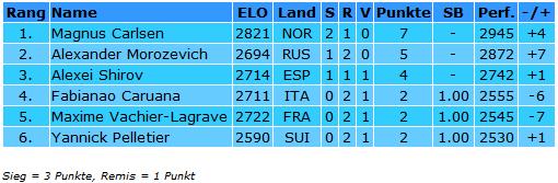 Die Teilnehmer am GM-Turnier Fabiano Caruana (2711), Yannick Pelletier (2590), Alexei Shirov (2714), Magnus Carlsen (2821), Alexander Morozevich (2694) & Maxime Vachier-Lagrave (2722)