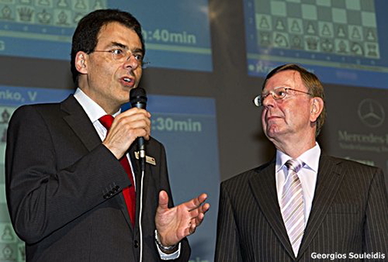 Den ersten Zug des Turniers führte Dortmunds Bürgermeisterin Birgit Jörder unter den Augen von Uwe Samulewicz, Herbert Bastian und Turnierdirektor Stefan Koth bei Vladimir Kramnik und Ruslan Ponomariov aus