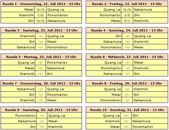 Mit einem ELO-Schnitt von 2731 wird die Turnierkategorie 20 erreicht. Rundenstart ist täglich um 15:00 Uhr, lediglich die letzte Runde beginnt bereits um 13:00 Uhr. Wie schon in den Vorjahren werden die Partien mit einer Verzögerung von 15 Minuten ins Internet übertragen. Ein Ruhetag wird eingelegt - nämlich am 26. Juli.