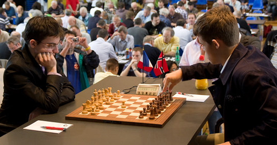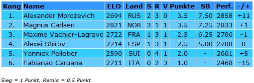 23.07.2011 - Rechtzeitig zur Halbzeit ist das ACCENTUS-Grandmaster Tournament in Biel wieder spannend. Während der bisher souverän führende Magnus Carlsen in einer spannenden Partie Maxime Vachier-Lagrave unterlag, konnte Alexander Morozevich gegen Fabiano Caruana gewinnen und so den Abstand auf einen Punkt (in Biel ein Remis) verringern. Die ganze Partie über hatte Vachier-Lagrave einen soliden Vorteil dazu genutzt, seinen norwegischen Gegenüber zu quälen, verpasste aber mindestens ein Mal den direkten Gewinn. Dennoch ist der Sieg für den Franzosen absolut verdient und für die Spannung im Turnier natürlich eine Wohltat. Die dritte Partie des Tages zwischen Yannick Pelletier und Alexei Shirov endete gerecht remis. Morgen ist der zweite Ruhetag, bevor es am Montag in die zweite Turnierhälfte geht, welche dann ohne Pause durchgespielt wird. Interessant für Statistiker und Verfechter der "1-Punkt-Regel": Morozevich würde nach Sonneborn-Berger-Wertung jetzt sogar vor Carlsen führen!