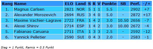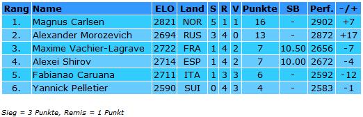 Die Teilnehmer am GM-Turnier Fabiano Caruana (2711), Yannick Pelletier (2590), Alexei Shirov (2714), Magnus Carlsen (2821), Alexander Morozevich (2694) & Maxime Vachier-Lagrave (2722)