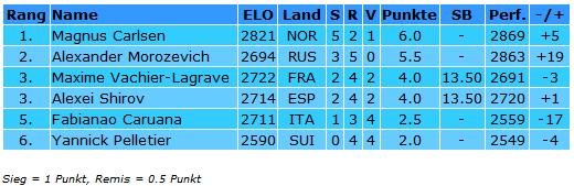 Die Teilnehmer am GM-Turnier Fabiano Caruana (2711), Yannick Pelletier (2590), Alexei Shirov (2714), Magnus Carlsen (2821), Alexander Morozevich (2694) & Maxime Vachier-Lagrave (2722)