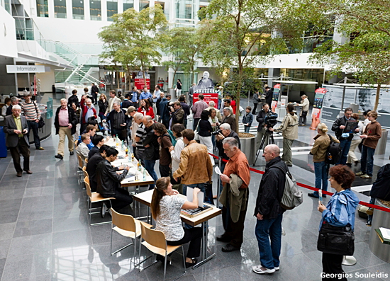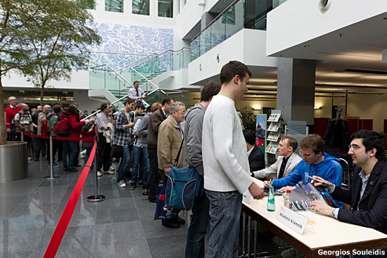 27.07.2011 - Die "Anti-Remis-Regel" beim 39. Sparkassen Chess-Meeting in Dortmund zeigt ihre Wirkung, wie man an der Zahl der gespielten Züge leicht erkennen kann, aber wenn sich alle Spieler nunmal ebenbürtig sind, kann es dennoch passieren, dass kein Blut fließt. So geschehen in der heutigen sechsten Runde. Vladimir Kramnik erspielte sich als Schwarzer zwar leichte Vorteile gegen Ruslan Ponomariov, aber der Ukrainer hielt den Laden zusammen. Zuvor hatten schon Liem Quang Le und Georg Meier den Punkt geteilt. Die längste Partie spielten Hikaru Nakamura und Anish Giri. Der Amerikaner eroberte zwar einen Bauern, aber im Endspiel war dies nicht genug. Unter dem Strich hat diese Runde nur Kramnik genützt - jetzt sind es nur noch vier Runden bis zu seinem zehnten Triumph beim Chess-Meeting. Es folgen - neben allen wichtigen Zahlen und Fakten - die gewohnt gelungenen Bilder der sechsten Runde sowie der gestrigen Autogrammstunde von Georgios Souleidis.