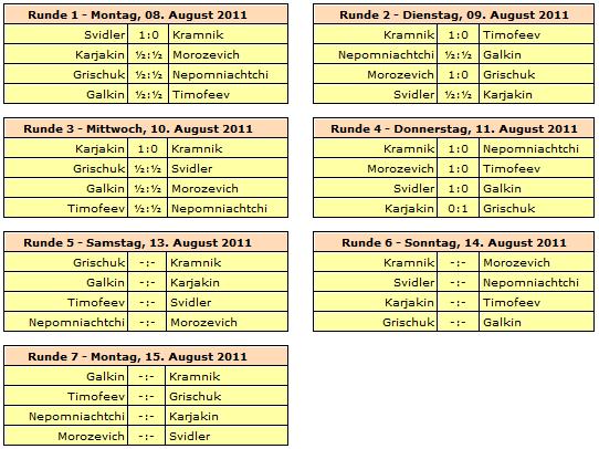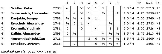 11.08.2011 - Aus Sicht der Fans kann ein Schachturnier gar nicht blutig genug sein - beinahe jedes Remis wird (oftmals zu Unrecht) negativ kommentiert. Jedoch keinen Grund zur Klage hatten die zahlreichen Kiebitze bei der heutigen vierten Runde des 64. Russischen Superfinales in Moskau. Keine der vier Partien endete unentschieden. Den Anfang machte Alexander Morozevich gegen Artyom Timofeev. Kurz vor der Zeitkontrolle hatte Moro noch einen Großteil seines Vorteils verspielt, aber sein Gegner schaffte den 40. Zug nicht und verlor einen Zug vor dem Ziel auf Zeit. Den nächsten Sieg heimste Peter Svidler ein. Er schlug sehr souverän Alexander Galkin und führt nun gemeinsam mit Morozevich die Tabelle an. Der nächste Sieger lautete Vladimir Kramnik. Der 14. Weltmeister besiegte Ian Nepomniachtchi und durchläuft derzeit ein wahres Auf und Ab. Zwei Siegen stehen nämlich auch schon zwei Niederlagen gegenüber. Und last but not least musste heute Sergey Karjakin seine erste Niederlage im Turnier hinnehmen. Die russische Nummer 1 unterlag Alexander Grischuk. Morgen dürfen sich die Spieler erholen, bevor es am Samstag mit der fünften Runde weiter geht.