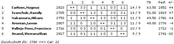 Mit einem ELO-Schnitt von sensationellen 2780 wird die bisher höchste Turnierkategorie 22 erreicht. Rundenstart in São Paulo ist täglich um 20:00 Uhr unserer Zeit. Aus Bilbao wird es dann keine Zeitverschiebung geben - dann beginnen die Partien um 16:30 Uhr.
