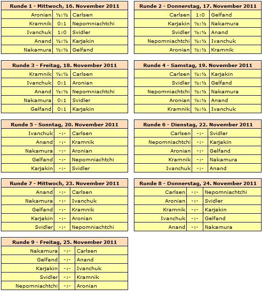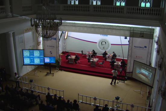 19.11.2011 - Zum ersten Mal wurde beim diesjährigen Tal Memorial eine Runde mit fünf Unentschieden beendet. Das lag keineswegs an einer etwaigen Friedfertigkeit der Teilnehmer. Ganz im Gegenteil, in jeder der fünf Begegnungen wurde bis zum letzten Blutstropfen gekämpft, aber die Attackierten verteidigten sich teils bravourös. Somit gibt es natürlich auch keine Veränderung in der Gesamtwertung. Es führen weiterhin Aronian, Carlsen, Nempomniachtchi und Karjakin mit einem halben Punkt Vorsprung auf Anand, Ivanchuk und Svidler. Morgen steht die fünfte Runde an. Danach dürfen sich die Spieler am Montag am Ruhetag erholen.