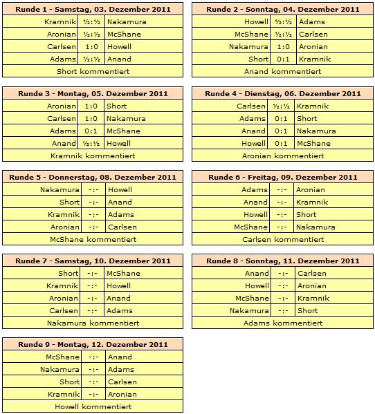 Mit einem ELO-Schnitt von 2748 wird die Turnierkategorie 20 erreicht. Rundenstart ist täglich um 15:00 Uhr unserer Zeit. Lediglich am Nikolaustag wird erst um 17:00 Uhr gestartet und in der Schlussrunde bereits um 13:00 Uhr. Der einzige gemeinsame Ruhetag wird am 07. Dezember eingelegt.