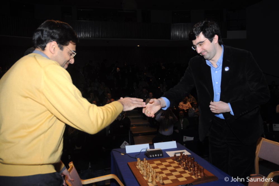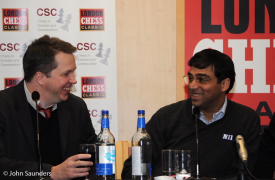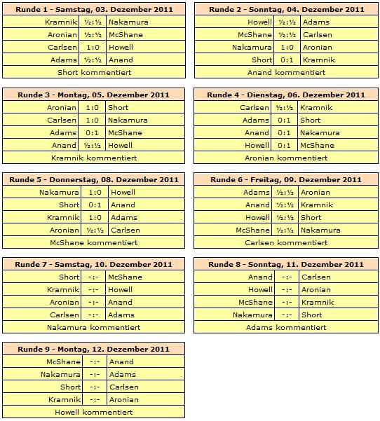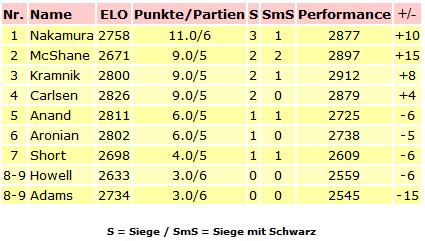 09.12.2011 - Im Gegensatz zu den bisherigen Runden legte die heutige sechste der London Chess Classic 2011 in Sachen Spannung einen Ruhetag ein. Während Magnus Carlsen als Co-Kommentator nicht eingreifen durfte und daher in der Tabelle leicht abrutschte, wurden die vier Partien seiner Konkurrenten zwar ordentlich ausgespielt, aber das Gleichgewicht nie entscheidend gestört. So stehen unter dem Strich vier Unentschieden und ein weiterhin führender Hikaru Nakamura. Selbiger wurde heute 24 Jahre alt und muss morgen den Zuschauer und Kommentator mimen. Sicherlich wird er auch Interessantes zu seiner Zusammenarbeit mit Garry Kasparov zu sagen haben.
