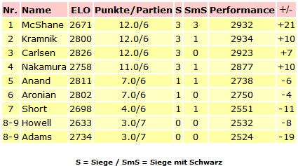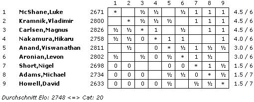 TopTurniere London Chess Classic - Carlsen, Kramnik und McShane siegen Hauchdünne Führung für den Briten