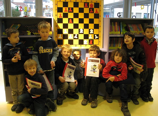 Die Erstklässler der Geschwister-Scholl-Schule in Schwalbach beim Gruppenfoto nach der 13.Übungstunde "Schach". Insgesamt sind 36 Kinder erstmals in Schach-AGs erfolgreich auf Vishy Anand's Spuren.