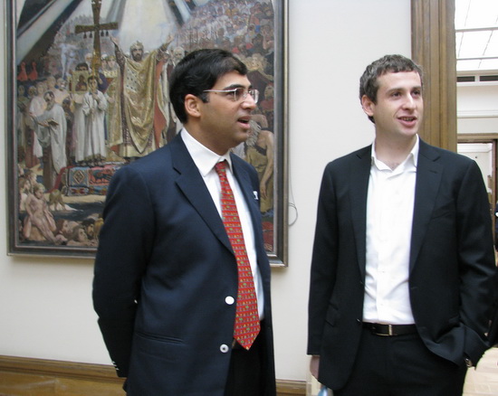 Weltmeister Viswanathan Anand mit den Präsidenten der russischen Schachföderation am Spielort der Schachweltmeisterschaft 2012 in der Tretyakov Gallery