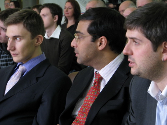 Der Weltmeister Viswanathan Anand (Indien) zwischen Peter Svidler (Russland) und Sergey Karjakin (Russland)