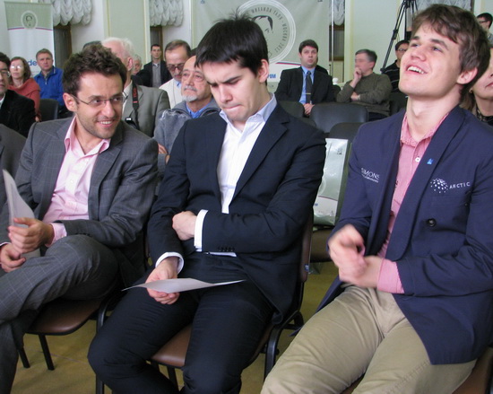 Nichts mit dem WM-Kampf zu tun haben die Sieger von 2011 Magnus Carlsen (Norwegen) und Levon Aronian (Armenien). In der Mitte sitzt Jan Nepomniachtchi (Russland)