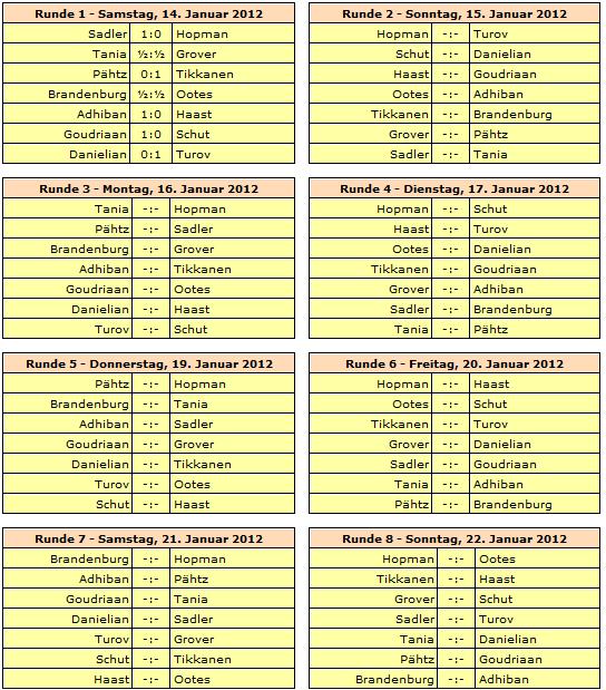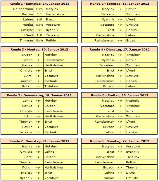 Rundenstart ist jeweils um 13:30 Uhr, lediglich die letzte Runde am 29. Januar beginnt bereits um 12:00 Uhr. Ruhetage werden am 18., 23. und 26. Januar eingelegt.