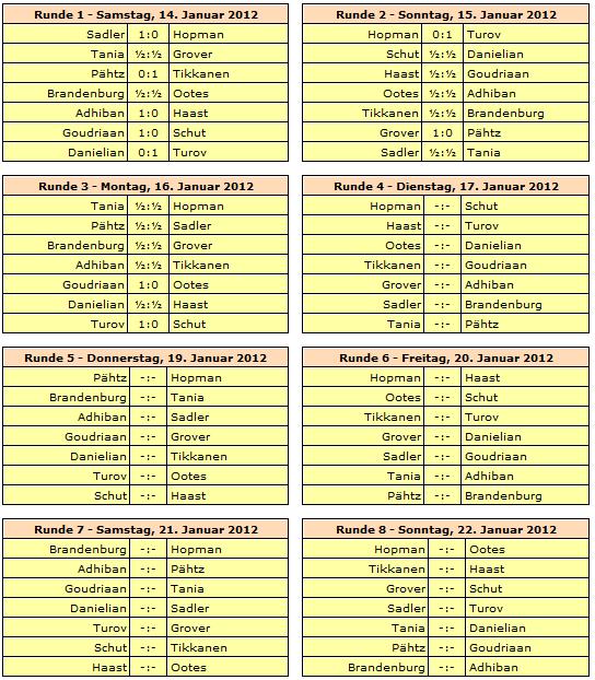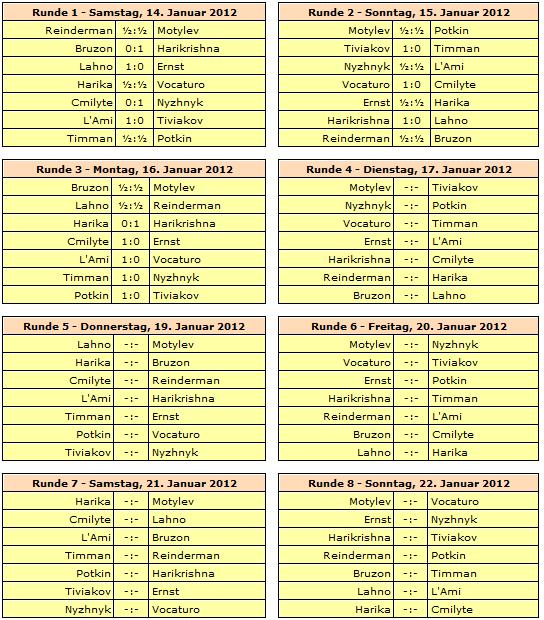 Rundenstart ist jeweils um 13:30 Uhr, lediglich die letzte Runde am 29. Januar beginnt bereits um 12:00 Uhr. Ruhetage werden am 18., 23. und 26. Januar eingelegt.