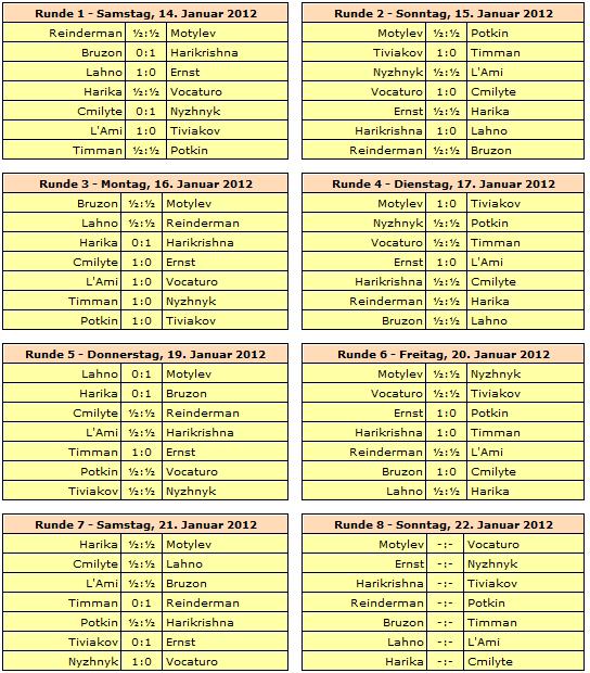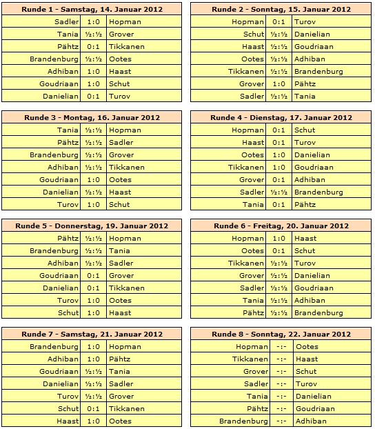 Rundenstart ist jeweils um 13:30 Uhr, lediglich die letzte Runde am 29. Januar beginnt bereits um 12:00 Uhr. Ruhetage werden am 18., 23. und 26. Januar eingelegt.