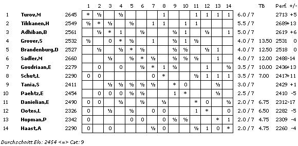 Die A-Gruppe erreicht mit einem ELO-Schnitt von 2754 die Kategorie 21 (2011: 2739/20), die B-Gruppe 2602 und Kategorie 15 (2658/17) und die C-Gruppe 2454 und Kategorie 9 (2507/11).