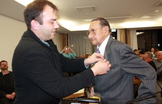 Oliver Uwira steckt Wolfgang Kossack die Ehrennadel an