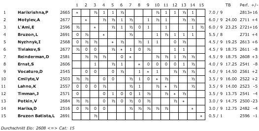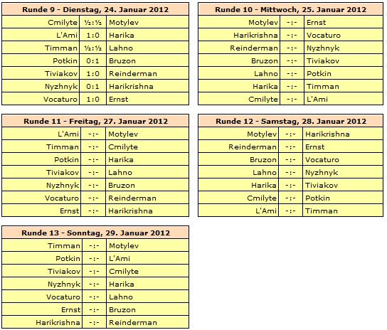 In der B-Gruppe konnte sich Spitzenreiter Pentala Harikrishna etwas mehr Luft verschaffen. Der Inder schlug mit Schwarz Teenager Illya Nyzhnyk, während Konkurrent Alexander Motylev von Viktorija Cmilyte nur einen halben Punkt erhielt. Mit unter den ärgsten Verfolgern ist nun (endlich) auch Erwin l'Ami angekommen, und auch Lazaro Bruzon hat vielleicht noch einen Funken Hoffnung. In der C-Gruppe führen seit der letzten Runde Maxim Turov und Hans Tikkanen gemeinsam die Tabelle an und tun dies auch nach der heutigen. Beide Spieler konnten ihre Partie gewinnen und werden den Gruppensieg wohl unter sich ausmachen. Elisabeth Pähtz trennte sich unentschieden von Elina Danielian. Die zehnte Runde beginnt am Mittwoch um 13:30 Uhr.
