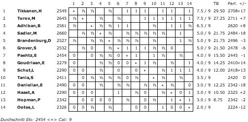 Die A-Gruppe erreicht mit einem ELO-Schnitt von 2754 die Kategorie 21 (2011: 2739/20), die B-Gruppe 2602 und Kategorie 15 (2658/17) und die C-Gruppe 2454 und Kategorie 9 (2507/11).