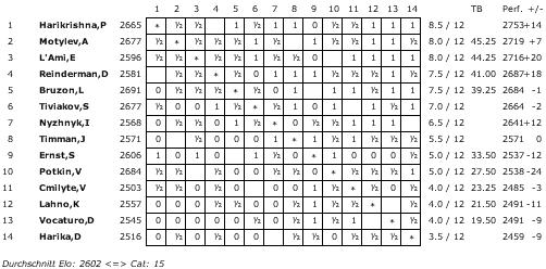 Die A-Gruppe erreicht mit einem ELO-Schnitt von 2754 die Kategorie 21 (2011: 2739/20), die B-Gruppe 2602 und Kategorie 15 (2658/17) und die C-Gruppe 2454 und Kategorie 9 (2507/11).