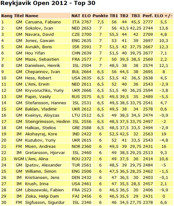 15.03.2012 - Vom 06. bis 13. März fand in der Hauptstadt Islands das neunrundige Reykjavik Open 2012 statt. Am Start waren 198 Spieler aus 33 Nationen. Klarer ELO-Favorit war der Italiener Fabiano Caruana, welcher letztlich auch mit 7,5/9 alleiniger Sieger wurde. In der Schlussrunde hätte es den aktuell Siebten der Weltrangliste jedoch beinahe erwischt, als er gegen Weltmeisterin Hou Yifan in Bedrängnis geriet, am Ende jedoch das rettende Remisufer erreichte. Dennoch, die Chinesin spielte nach Gibraltar erneut ein sehr starkes Turnier und nähert sich Step by step der 2700er-Marke. Rang 2 ging an Ivan Sokolov vor David Navara auf Rang 3.