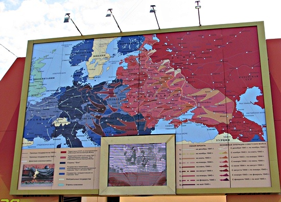 Die russische Rückeroberung Russlands aus der "Tiefe des Raumes" wird auf riesigen Projektionsflächen graphisch dargestellt, die den Anfang vom Ende des 2.Weltkrieges demonstriert