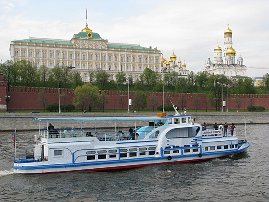 Ausflugsschiffe auf der Moskwa - Hintergrund der Kreml: Terempalast & Facettenpalast