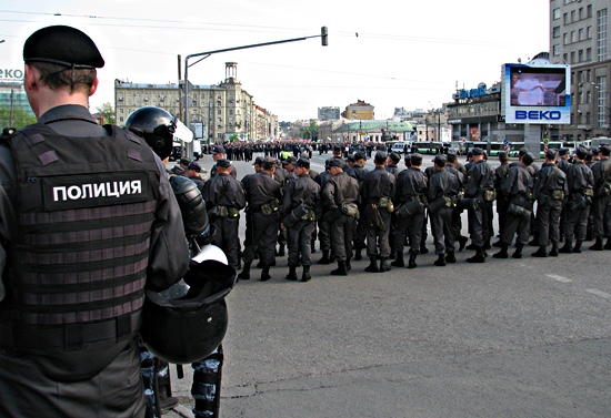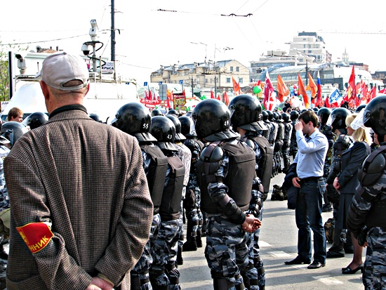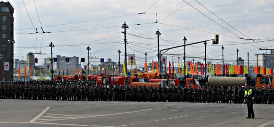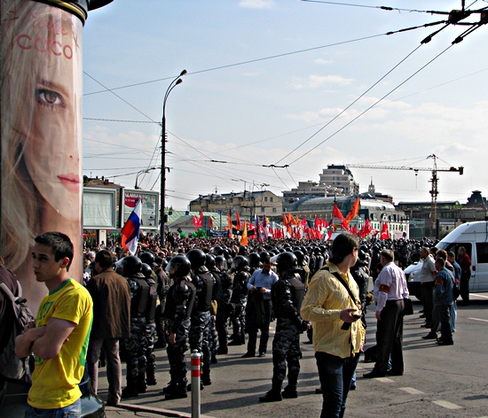 Mit sehr hohem Polizeiaufwand wurde der angekündigte und genehmigte Demonstrationszug des "Hetrogenen Protestes" vom Marsch zum Regierungssitz des Präsidenten Putin vor seiner Introhnisation abgehalten. Die Staatsordnung in Russland, sowie die Sicherheit auf den Straßen wird mit hohem Aufwand gerade an solchen Tagen, an denen viele ausländische Staatsgäste erwartet werden, enorm wichtig genommen und aufwändig durchgeführt. Das Kräfteverhältnis zwischen Ordnungshüter und Demonstranten wurde auf 1:1 eingeschätzt, später standen sich 8-9.000 Demonstranten 14-15.000 Polizeikräften und Sondereinsatzkommandos gegenüber. Ungefähr 4 Stunden dauerte der Aufmarsch. Es kam zu kleinen und heftigen Ausschreitungen, von denen sogar in Deutschland gemeldet wurde.