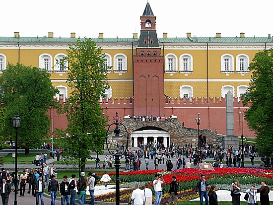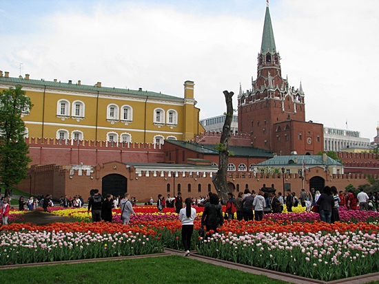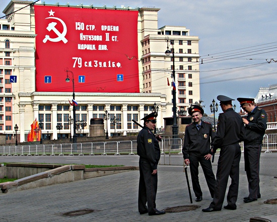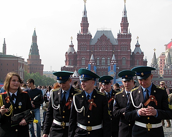 Als das eher diesige, regnerische Wetter am Morgen des 9.Mai sich gegen Mittag in freundliches Wetter mit sehr angenehmen Temperaturen wandelte, waren die Moskauer und auch ihre zugereisten Gäste aus ganz Russland wie Ameisen um den Kreml herum unterwegs. Allerdings wurde beim Betreten und Verlassen ihre Taschen untersucht oder auch hin und wieder ein Personalausweis kontrolliert. Offensichtlich ist die Befürchtung, terroristischen Anschlägen ausgesetzt zu werden, so groß, dass ein enorm hoher Aufwand staatlicherseits betrieben werden muss, um die Bürger zu schützen. Im Übrigen kann man feststellen, dass eine Menge privatwirtschaftlicher Sicherheitsdienste in Moskau gebraucht werden, um das Wohlbefinden Einzelner zu schützen. Gerade an nationalen Feiertagen, an denen man derer gedenkt, die durch Ungerechtigkeit oder gar Willkür ums Leben gekommen sind, können doch erhebliche Emotionen geweckt werden, die noch nach Jahrzehnten ausbrechen können. Allein, wenn man 30 Minuten vor der großen Demonstrationstafel steht, die das Vertreiben der deutschen Truppen aus ihrer Heimat Russland zeigt, kann man sich das Leid und Elend vorstellen, die dieser sinnlose 2.Weltkrieg verursacht hat. Allein das jährliche Pilgern zum "Grabmal des unbekannten Soldaten" und das laute Wehklagen kann einem richtig an die Nieren gehen. Das Niederlegen von roten Nelken ist die symbolische Handlung, um den geliebten Menschen nicht zu vergessen.