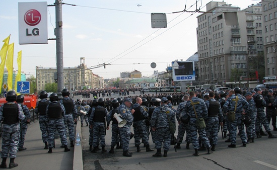 Den dritten Ring bildeten die Polizeieinsatzkräfte vor der Bol. Kamenny (Brücke), damit der Demonstrationszug sich auf keinen Fall dem Regierungssitz des Präsidenten im Kreml nähern kann.