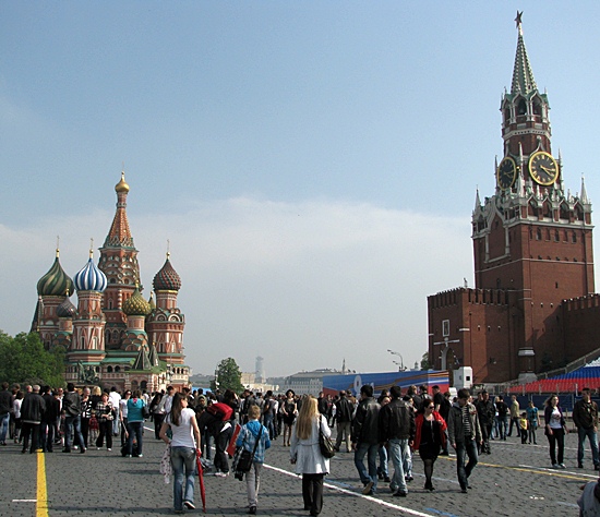 Die Basilius-Kathedrale und der Erlöserturm mit seiner großen Uhr sind wohl die meist fotografierten Motive in Moskau.