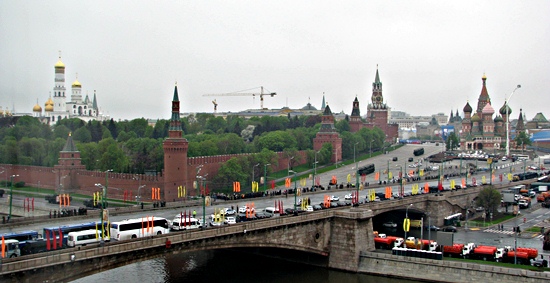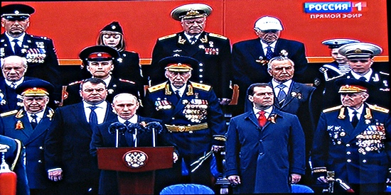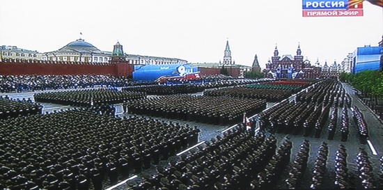 Gut einsehen konnte man vom Fenster des Hotel Baltschug Kempinski die vom "Roten Platz" abmarschierenden Truppen, beziehungsweise abfahrenden Militärfahrzeuge. Allerdings mussten die Fenster zur Straßenseite hin geschlossen gehalten werden, so hoch war die Sicherheitsstufe für die umliegenden Gebäude einzuhalten. Die Qualität der Bilder ist natürlich dadurch etwas dürftiger als sonst. Mit direktem Fernsehkontakt war der "Rote Platz" mit der weltweit ausgestrahlten einmaligen Zeremonie quasi mit allen Wohnzimmern nicht nur in Russland verbunden. Eine gewaltige Demonstration der Stärke, auch für den für 6 Jahre wiedergewählten Präsidenten Vladimir Putin. Alt-Kanzler Gerhard Schröder zählte zu den 3.000 geladenen Gästen.