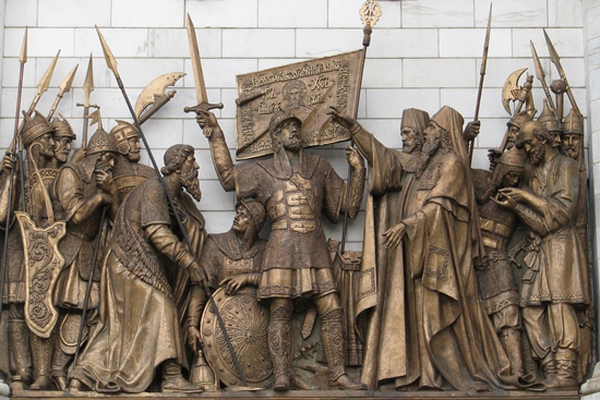 Die Christi-Erlöser-Brücke mit der Statue "Peter des Großen" auf seinem Segelschiff.