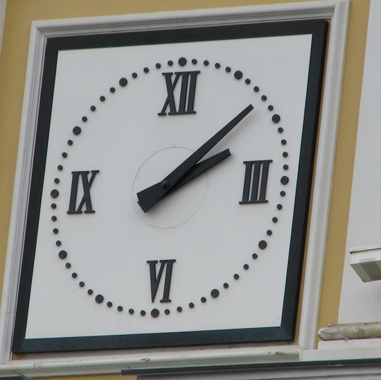 Um genau 14:08 Moscow time passierte der Fotograf die Ampel und diese Uhr hochoben hinter der Querstraßel des Hotel Baltschug auf dem Weg zur Tretjakow Galerie