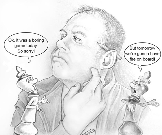18.05.2012 - Fünf Remisen in Serie...so langsam gehen unserem WM-Zeichner Fränk Stiefel die Ideen aus. Also hat sich unser Künstler kurzerhand mal selbst aufs Blatt gezaubert und drückt damit seinem Unmut über den Mangel an langen und spannenden Partien aus. Immerhin, die beiden Könige scheinen das Dilemma selbst zu erkennen und geloben feierlich Besserung. Noch gibt es für Anand und Gelfand genügend Gelegenheiten, der Schach-WM in Moskau Leben zu verleihen und Stiefel Futter für neue Zeichnungen zu liefern, damit sich dieser letztlich nicht auch noch ein Ohr abschneiden muss...