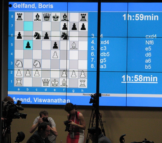 Die 5.Partie zeigte ein weiteres Mal pur, wie modernes GM-Schach mit Schwarz präsentiert werden muss. Sogar mit bisher ungespielten Systemen, wie der Sveshnikov-Variante, kann der Herausforderer Boris Gelfand mühelos seine Schwarzpartie gegen den Weltmeister aus Indien remis halten. Oder war es nur ein weiterer geschickter Schachzug, dem Weißspieler zu zeigen, wie ein perfektes Catenaccio (Begriff aus dem italienischen Fussball) anzuwenden ist. Leichtes Murren bei den Schachfans, obwohl sie wissen, welchen Aufwand die beiden Gegner in der gut viermonatigen Vorbereitung auf diese WM sich geleistet haben. Boris Gelfand sagt ja frank und frei: "Er hat sich in Wirklichkeit ein Leben lang auf diesen, seinen ersten Weltmeisterschaftskampf vorbereitet". Die Matchplay-WM ist die allerhöchste Stufe des Schachspielens unter Weltklasse-GMs. Im Presseraum wurde auf die Bemerkung, dass wir uns keine Sorgen machen müssen, um die Zukunft des Schachs, notfalls können wir ja auf Robert James "Bobby" Fischers Idee Chess960 umsteigen - möglicher Weise in 500 Jahren! Die Antwort des moldawischen Großmeisters, der am 8.Juni in Bad Homburg ein Simultan geben wird: "Ich befürchte es wird sehr viel früher sein"!