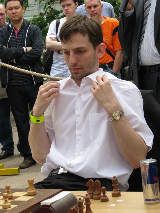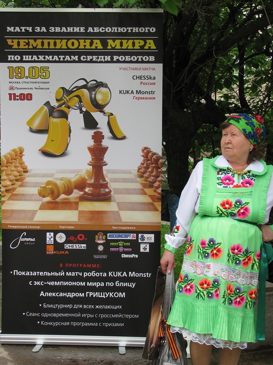 Der russische Weltmeister im Blitzschach, Alexander Grischuk, setzte sich hier in Moskau an einen Tisch mit einem Roboter aus Deutschland, dessen schachliche Fähigkeiten wohl aus dem bekannten Schachprogramm von Rybka 4 stammen soll. Der Vater des Schachprogramms ist Vasik Railich, der unter der USA-Flagge firmiert, und in den letzten Jahren die führende Engine unter den spielstärksten Programmen perfektioniert hatte. Im Match um den "World Robot Chess Champion" hatte er sich am gleichen Tag zuvor gegen CHESSka aus Russland durchgesetzt und somit gegen den Top10-Spieler und World-Blitz-Champion Grischuk durchzusetzen. In der Qualifikation des Kandidatenturniers in Kazan (Russland) war er an Boris Gelfand im Finale gescheitert. Ich glaube, er hätte dieser Tage lieber in der Tretjakov-Galerie gesessen und gegen Anand gespielt, als sich hier in 5-Minuten-Partien von einem nimmermüden Gegner bearbeiten zu lassen. Trotz des ungleichen Kampfes konnte Grischuk am Anfang in den drei Weißpartien gut mithalten und verlor erst die 4 Partie mit Schwarz, alle anderen waren vorher remis ausgegangen!! Wow, Mensch - Maschine ist auch ziemlich ausgeglichen, dachte ich, wobei die Zeit eine entscheidende Rolle gegen den Mensch einnimmt. Danach drehte Alexander das Risiko Not gedrungen höher und verlor prompt die letzten zwei Partien auch noch. Vielleicht war neben der beginnende Müdigkeit auch die notwendige Präzision nicht mehr da, sodass es am Ende 4,5:1,5 für den deutschen Roboter "KUKA" hieß. Alles in allem sahen wir ein unglaubliches Spektakel und viele Schachinteressierte kamen spielten selbst Schach und amüsierten sich im "Grünen" des Strastnoy Boulevard mitten in Moskau.