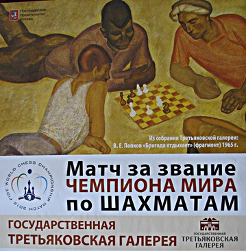 Auf dem Bauch liegend gemeinsam "Schach" spielen. Für wen der Künstler die einzelnen Personen in ihrer Form und Wirkung kreiert hat, haben wir bisher noch nicht heraus gefunden, aber die Leitgedanken wurden klar. Vishy Anand (dunkler Teint) und Boris Gelfand (heller Teint) sind mit weiteren am Spiel interessierten, gelangweilten oder gar abgewandten Personen zusammen. Wir versuchen bis zum Ende einmal, dass ganze Bild zusammenzusetzen. Die WM-Farben sind uns sehr symphatisch, schließlich basieren sie auch auf den Chess Classic Farben: sand und schwarz.
