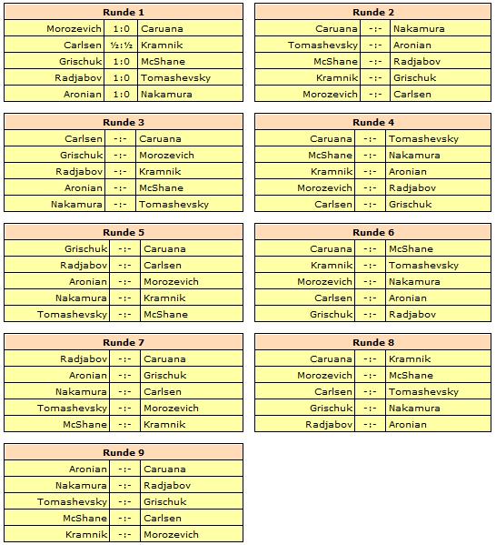 Mit einem ELO-Schnitt von 2776,4 wird hauchdünn die Turnierkategorie 22 erreicht. Remisangebot sind nicht vor Vollendung des 40. Zuges gestattet.