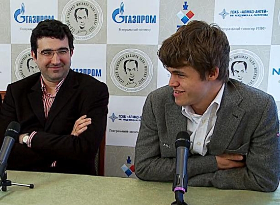 08.06.2012 - Der Startschuss zum z. Tal Memorial fiel eigentlich schon gestern mit einem Blitzturnier, in welchem die Startnummern für das heute begonnene Hauptturnier ausgespielt wurden. Es siegte übrigens Alexander Morozevich nach Zweitwertung mit 6,5/9 vor dem punktgleichen Magnus Carlsen. Eine "deutsche Tabelle" nebst Partien erhalten Sie bei ChessBase. Der Auftakt des 7. Tal Memorials verspricht einen spannenden Verlauf. Die kürzeste Partie lieferten Magnus Carlsen und Vladimir Kramnik. Der Russe erspielte sich als Schwarzer eine gute Stellung gegen die Nummer 1 der Weltrangliste, doch bei knapper werdender Zeit traute er sich nicht, aufs Ganze zu gehen und entschied sich nach nur 23 Zügen für eine dreifache Zugwiederholung. Den ersten vollen Punkt erzielte Teimour Radjabov, welcher Evgeny Tomashevsky das Nachsehen gab. Einige Zeit später hatte auch Levon Aronian gegen Hikaru Nakamura ein klar gewonnenes Turmendspiel auf dem Brett und verwertete sicher. Der nächste Sieg gelang Alexander Morozevich gegen Fabiano Caruana. Nach fast sechs Stunden entschied der weiße Freibauer auf der a-Linie die Partie. Den vierten Weißsieg des Tages machte dann wenig später Alexander Grischuk gegen Luke McShane perfekt. Die zweite Runde beginnt am Samstag um 13:00 Uhr.