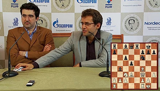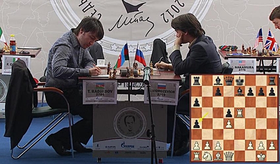 12.06.2012 - Der Aufzug des Königsbauers im ersten Zug gilt als die aggressivste Weise, eine Partie zu eröffnen - von daher versprach die vierte Runde des Tal Memorials viel, denn alle Begegnungen begannen heute so. Doch letztlich sollte nur eine Partie blutig enden. Fabiano Caruana fuhr einen überlegenen Sieg gegen Evgeny Tomashevsky ein und egalisierte so seine Niederlage aus der ersten Runde. Das spannendste Remis des Tages kreierten Magnus Carlsen und Alexander Grischuk in einer packenden Zeitnotschlacht, welche letztlich in einer dreimaligen Zugwiederholung gipfelte. Auch Luke McShane stand lange ausgezeichnet gegen Hikaru Nakamura, aber bei knapper Bedenkzeit driftete der Brite in ein Turmendspiel mit Minusbauer, welches jwdoch Remis war. Zur "Strafe" spielte Naka bis zum bitteren Ende (Patt) weiter. Auch Vladimir Kramnik gegen Levon Aronian und Alexander Morozevich gegen Teimour Radjabov spielten auf Sieg, konnten das Gleichgewicht jedoch nicht entscheidend stören. Somit führen weiterhin Moro und Radja mit einem halben Zähler vor Kramnik. Die fünfte Runde beginnt am Mittwoch wie gewohnt um 13 Uhr.
