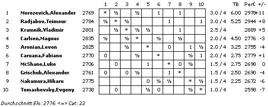 Mit einem ELO-Schnitt von 2776,4 wird hauchdünn die Turnierkategorie 22 erreicht. Remisangebot sind nicht vor Vollendung des 40. Zuges gestattet.