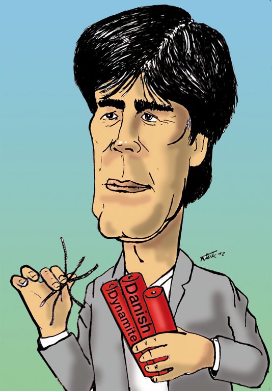 19.06.2012 - "We are red, we are white - we are Danish dynamite", so lautet ein beliebter Schlachtruf der dänischen Fußball-Fans, doch was nützt es, wenn der Sprengsatz nicht zündet? Für den gesperrten Jerome Boateng hatte Bundes-Jogi Löw Lars Bender in die Verteidigung der rechten Flanke unseres Teams berufen und damit offensichtlich mal wieder alles richtig gemacht. Rund zehn Minuten vor dem Ende spurtete der Aushilfs-Verteidiger über den ganzen Platz, um den Dänen das entscheidende 2:1 zu verpassen. Dies bewegte unseren Zeichner Fränk Stiefel dazu, Joachim Löw spontan zum Sprengstoffexperten zu erklären, der einen erstaunlich einfachen Weg wusste, wie man dänisches Dynamit entschärft. Doch sehen Sie selbst...
