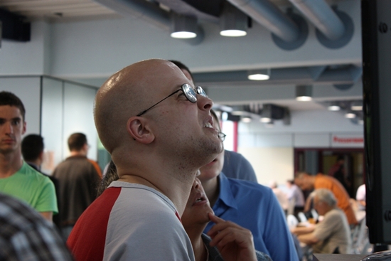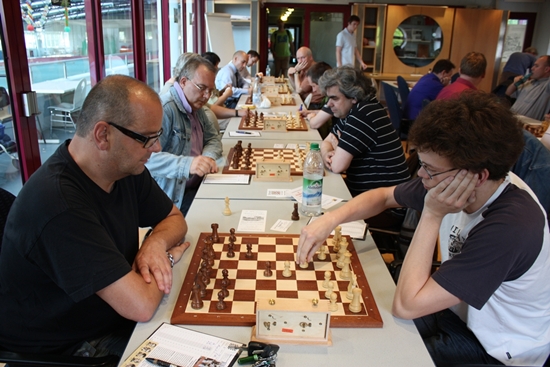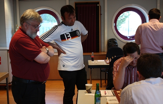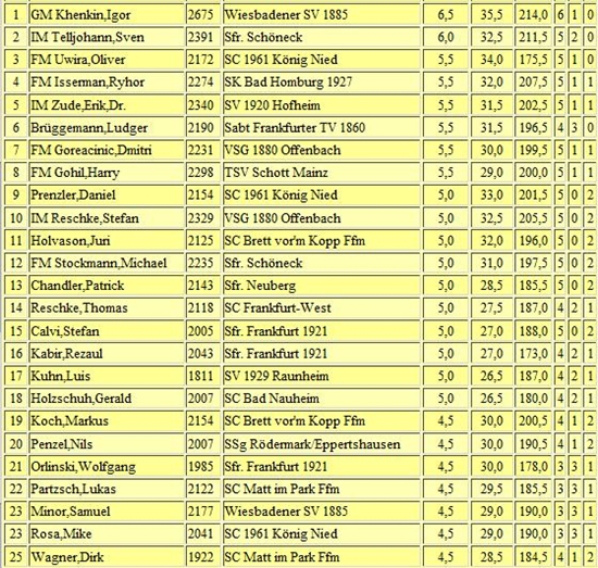 Um "Mr. 100 Prozent" Ryhor Isserman zu stoppen bedurfte es schon den Einsatz von "Boss" Igor Khenkin persönlich. Der deutsche Nationalspieler hatte Schwarz und musste gegen den Senior durchaus schwer um den Sieg kämpfen, wie er bei einem seiner Kurzbesuche an der frischen Luft unumwunden zugab. Doch am Ende siegte die Klasse über Kampfgeist, und der Favorit übernahm vor der Schlussrunde wieder die alleinige Führung in der Tabelle. Für die Fehleinschätzung der sechsten Runde sorgte Daniel Prenzler im Duell gegen IM Erik Zude. Zwar eroberte der Hessenliga-Spieler aus der Eröffnung heraus eine Qualität, überschätzte dabei aber gründlich seine Siegchancen. Martialisch kündigte er beim Luftschnappen an, seinem irdischen Dasein ein Ende zu setzen, sollte er noch verlieren. Sein Glück, dass ihn niemand an sein Versprechen erinnerte, als ihn der Meister im 40. Zug zur Aufgabe zwang.