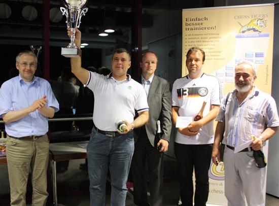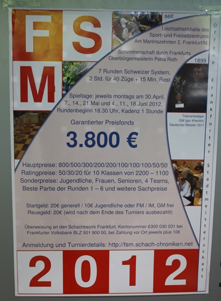 21.06.2012 - Vom 30. April bis 18. Juni fand in 7 Runden Schweizer System die offene Frankfurter Stadtmeisterschaft 2012 statt. 157 Schachfreunde spielten in einem A- und B-Turnier im Sport- und Freizeitzentrum im Frankfurter Stadtteil Kalbach um die zahlreichen Preise und DWZ-Punkte. Wer jedoch Stadtmeister werden wollte, wusste vorher, dass er auf eine schier unüberwindbare Hürde treffen würde. Großmeister Igor Khenkin trat nämlich an, seinen im Vorjahr errungenen Titel zu verteidigen und er tat dies mit 6,5 Punkten erwartet souverän. Mit einem halben Zähler weniger musste IM Sven Telljohann mit dem zweiten Rang Vorlieb nehmen, wobei er der einzige Spieler war, der dem amtierenden deutschen Vize-Meister einen halben Zähler rauben konnte. Dritter wurde FM Oliver Uwira, obwohl er nur sechs der sieben Runden mitspielen konnte. Es folgt ein ausführlicher Bericht mit Partien und zahlreichen Bildern.