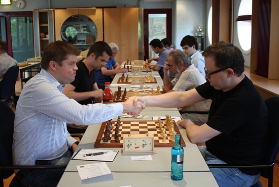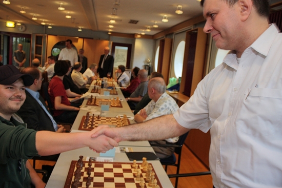 ...während GM Igor Khenkin am Spitzenbrett seinen Gegner Luis Kuhn begrüßte