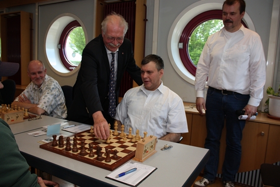 Sehr erfreulich und eine echte Würdigung war zum Auftakt der Stadtmeisterschaft das Erscheinen von Stadtrat Claus Möbius von Die Grünen, welcher zur Eröffnung das Wort an die Teilnehmer richtete und dabei einigen S(ch)achverstand bewies. Anschließend führte er für den einzigen Großmeister im Feld den ersten Zug aus und schaute noch eine ganze Weile sehr interessiert den Spielenden zu. Größere Überraschungen blieben zum Auftakt nahezu aus. Als einziger Titelträger musste sich FM Bernd Röschlau mit einem Remis begnügen, nachdem er gegen das Lettische Gambit von Gegner Andreas Weber sogar in ernste Verlustgefahr geraten war.