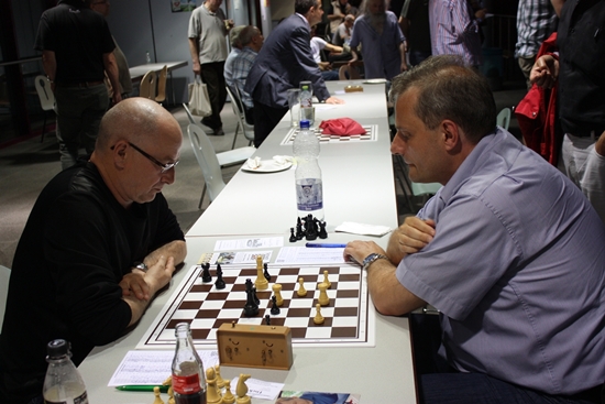 Die allerletzte Partie der FSM 2012 zwischen Manfred Neumann (links) und Martin Zerhusen endete in einem wilden Blitzfinale...