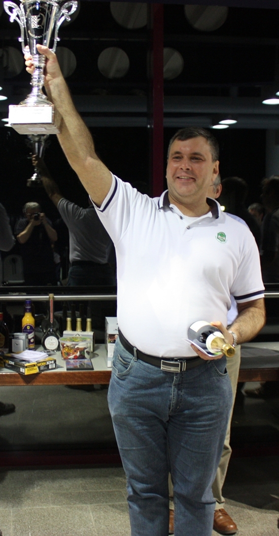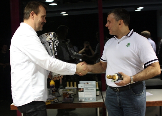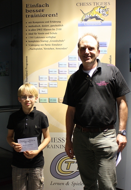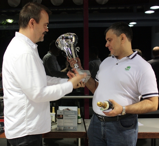 Lassen Sie sich nicht täuschen! Hier übergibt Hans-Dieter Post den Wanderpokal nicht, er nimmt ihn dem Champ wieder weg! Erstens fehlt noch die Gravur und zweitens ist der von Weltmeister Viswanathan Anand signierte "Pott" ein Wanderpokal und steht vermutlich beim Turnierleiter auf dem heimischen Schreibtisch und wird täglich poliert!